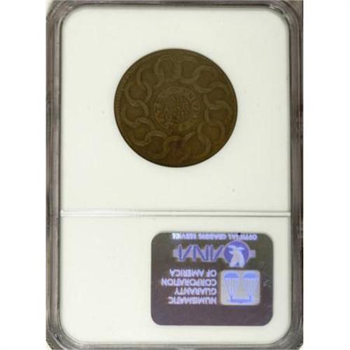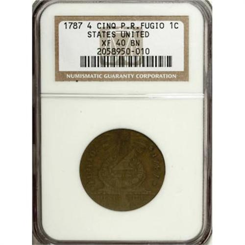 <B>1787 1C Fugio Cent, STATES UNITED, Cinquefoils XF40 NGC.</B></I> Newman 8-X, R.1. The late die state with a heavy obverse die break or cud at 6 o'clock. Sharply defined for the grade, and the chocolate-brown surfaces are smooth save for two thin marks on the right obverse field. Listed on page 83 of the 2008 <I>Guide Book.</B></I><BR><BR><b>Shipping:</b> Coins & Currency (<a target="_blank" href="http://www.heritageauctions.com/common/shipping.php">view shipping information</a>)