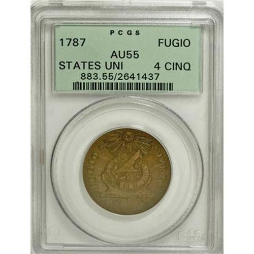 <B>1787 1C Fugio Cent, STATES UNITED, Cinquefoils AU55 PCGS.</B></I> Newman 11-X, R.4. This golden-brown Fugio Cent has impressive sharpness on the sun, sundial, and reverse legends. Completely problem-free aside from brief circulation wear. The right-side obverse margin is boldly clashed. In a green label holder, and listed on page 83 of the 2008 <I>Guide Book.</B></I><BR><BR><b>Shipping:</b> Coins & Currency (<a target="_blank" href="http://www.heritageauctions.com/common/shipping.php">view shipping information</a>)