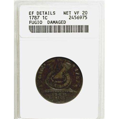 <B>1787 1C Fugio Cent, STATES UNITED, Cinquefoils--Damaged--ANACS. XF Details, Net VF20.</B></I> Newman 12-X, R.2. A few relatively minor rim bruises account for the harsh ANACS designation. Richly detailed, but with a deep planchet flaw on the obverse border near 10 o'clock. A variety found within the <I>Bank of New York</B></I> hoard. Listed on page 83 of the 2008 <I>Guide Book.</B></I><BR><BR><b>Shipping:</b> Coins & Currency (<a target="_blank" href="http://www.heritageauctions.com/common/shipping.php">view shipping information</a>)