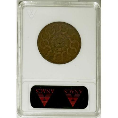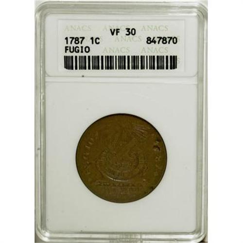 <B>1787 1C Fugio Cent, STATES UNITED, Cinquefoils VF30 ANACS.</B></I> Newman 13-X, R.1. A chocolate-brown example that appears to have the sharpness of a higher grade. A planchet flaw (as made) affects the first 7 in the date, and a small verdigris spot is noted above the 1. Listed on page 83 of the 2008 <I>Guide Book.</B></I><BR><BR><b>Shipping:</b> Coins & Currency (<a target="_blank" href="http://www.heritageauctions.com/common/shipping.php">view shipping information</a>)