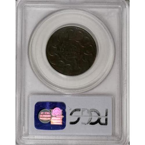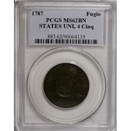 <B>1787 1C Fugio Cent, STATES UNITED, Cinquefoils MS62 Brown PCGS.</B></I> Newman 13-X, R.1. The vertical die crack at 6 o'clock on the reverse is practically diagnostic for the X reverse. This surprisingly unabraded chocolate-brown representative is pleasing despite unimportant indifference of strike localized to the left borders. Struck from a prominently clashed obverse die. Listed on page 83 of the 2008 <I>Guide Book.</B></I><BR><BR><b>Shipping:</b> Coins & Currency (<a target="_blank" href="http://www.heritageauctions.com/common/shipping.php">view shipping information</a>)