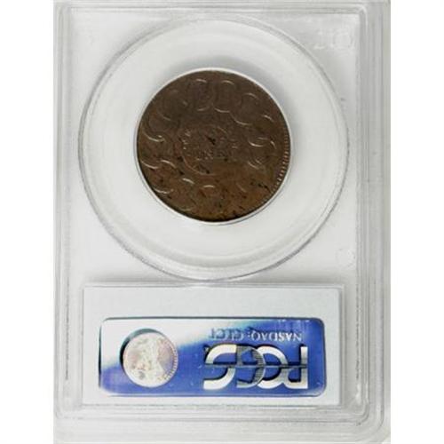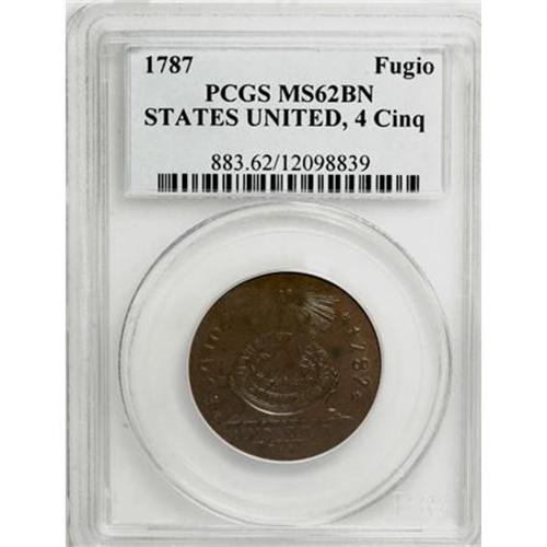 <B>1787 1C Fugio Cent, STATES UNITED, Cinquefoils MS62 Brown PCGS.</B></I> Newman 13-X, R.1. The vertical die break at 6 o'clock on the reverse quickly identifies the X reverse. This high grade chocolate-brown Fugio cent likely originated in the famous Bank of New York hoard. The strike is exceptional on the sun and sundial, and both sides are uncommonly unabraded. A few dark planchet flaws, as produced, are all that limit the grade. Listed on page 83 of the 2008 <I>Guide Book.</B></I><BR><BR><b>Shipping:</b> Coins & Currency (<a target="_blank" href="http://www.heritageauctions.com/common/shipping.php">view shipping information</a>)