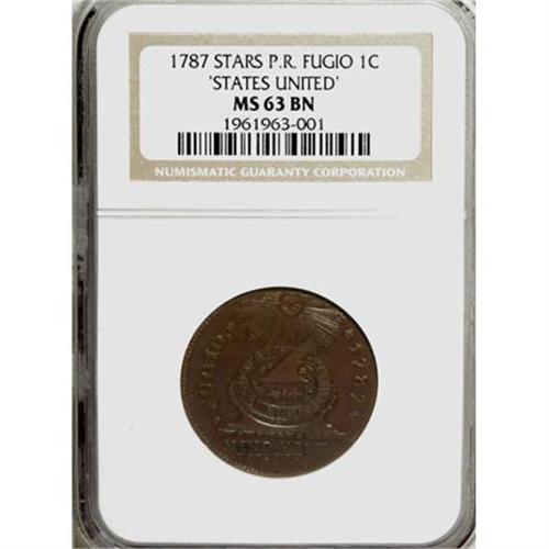<B>1787 1C Fugio Cent, STATES UNITED, Eight-Pointed Stars MS63 Brown NGC.</B></I> Newman 15-Y, R.3. The sole variety with eight-point stars on the reverse label. An earlier die state without the break on the 5 o'clock ring. Satin luster shimmers from the splendidly smooth chocolate-brown surfaces. Slightly off center toward 3 o'clock, affecting only the dentils. Listed on page 83 of the 2008 <I>Guide Book.<BR>From The Liberty Collection of United States Colonial Coinage.</B></I><BR><BR><b>Shipping:</b> Coins & Currency (<a target="_blank" href="http://www.heritageauctions.com/common/shipping.php">view shipping information</a>)