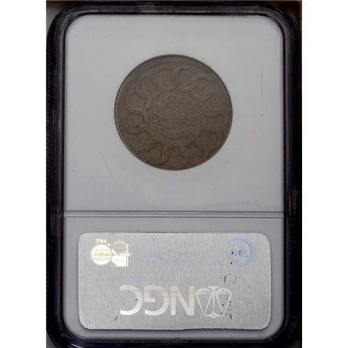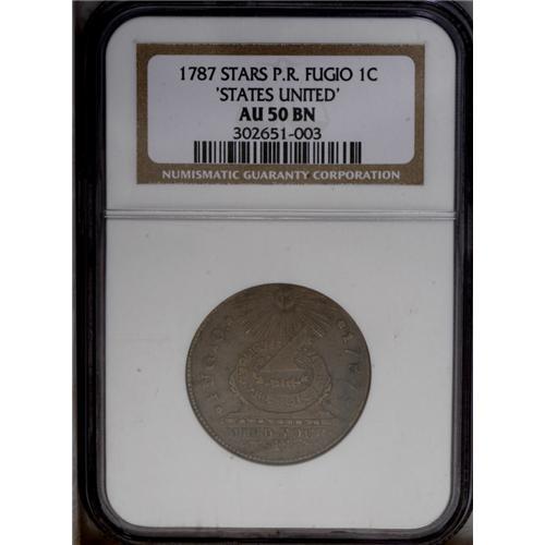 <B>1787<1C> Fugio Cent, STATES UNITED, Eight-Pointed Stars AU50 NGC.</B></I> Newman 15-Y, R.3. Diagnostic die break extends from the sundial to the obverse border at 4 o'clock. Both sides exhibit pleasing medium brown color with underlying tinges of violet. As with many seen, only the upper star on the reverse is plainly visible. Listed on page 83 of the 2006 <I>Guide Book.</B></I>