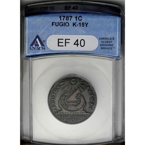 <B>1787<1C> Fugio Cent, STATES UNITED, Eight-Pointed Stars XF40 ANACS.</B></I> Newman 15-Y, R.3. One of the nicer examples of this variety that we have examined. Well struck with excellent remaining details and no distracting abrasions on either side. Moderately and evenly worn. Listed on page 83 of the 2007 <I>Guide Book.</B></I>
