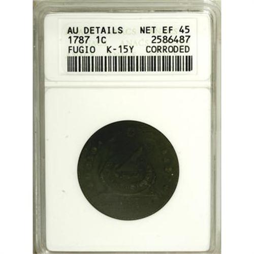 <B>1787 1C Fugio Cent, STATES UNITED, Eight-Pointed Stars--Corroded--ANACS. AU Details, Net XF45.</B></I> Newman 15-Y, R.3. The distinctive reverse variety with a pair of eight-pointed stars that separate STATES and UNITED on the inner ring. The diagnostic die break extends from the sundial to the obverse border at about 4 o'clock. Medium to dark brown surfaces display sharply impressed and well centered design elements. Some localized, minor microporosity appears on the reverse, but all in all, the surfaces are pleasing.<BR><BR><b>Shipping:</b> Coins & Currency (<a target="_blank" href="http://www.heritageauctions.com/common/shipping.php">view shipping information</a>)
