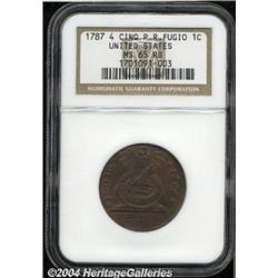 <B>1787<1C> Fugio Cent, UNITED STATES, Cinquefoils MS65 Red and Brown NGC.</B></I> Newman 8-B, R.3. A gorgeously undisturbed Gem that is essentially free from the planchet flaws and impurities often encountered on this series. Orange color dominates the protected areas, while the highpoints of the devices and the exposed fields have medium lilac hues. Due to the die alignment, the upper obverse and the lower reverse are needle-sharp, while the upper right reverse and the right side of BUSINESS have softer definition, as made. Struck from a boldly clashed reverse die. Surely among the finest known survivors of this variety, which is seen less often than the various STATES UNITED reverses. Listed on page 63 of the 2004 <I>Guide Book.</B></I> <BR><BR><B>Important notice:</B> Heritage usually auctions material at the rate of 200-250 lots per hour. On some occasions eBay Live bid software or the Internet may not be able to keep up with the pace of the auction. We recommend placing a realistic absentee bid now as insurance to avoid disappointment. Occasionally the auctioneer may eliminate or reject an eBay Live bid, and the auctioneer may also reopen a lot after the close of the eBay live bidding (usually because we missed an audience bid), and may reject your bid even if it shows you as the winning bidder. By bidding via eBay Live, you agree that Heritage may award the lot to another bidder at its sole discretion under the circumstances described above or any other reasonable circumstances. Since eBay bids are not shown to us until we open the lot on the floor, we treat those bids just like floor bids. In most cases the floor responds before the eBay bid is presented to us, due to Internet lag time, so for consistency we have made it a policy that floor bids are always considered first over tie eBay live bids. Also please note that all Heritage lots purchased through eBay Live carry a 20% Buyer's Premium. Please make sure you read the Terms and Conditions before you bid.