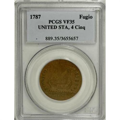 <B>1787 1C Fugio Cent, UNITED STATES, Cinquefoils VF35 PCGS.</B></I> Newman 16-H.1, R.5. A very scarce variety that has only appeared once in a Heritage auction this decade. UNITED STATES Fugios are nearly always Newman 8-B. An evenly circulated light to medium brown piece with a heavy vertical die crack on the reverse at 6 o'clock. Listed on page 83 of the 2007 <I>Guide Book.</B></I><BR><BR><b>Shipping:</b> Coins & Currency (<a target="_blank" href="http://www.heritageauctions.com/common/shipping.php">view shipping information</a>)
