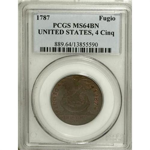 <B>1787 1C Fugio Cent, UNITED STATES, Cinquefoils MS64 Brown PCGS. CAC.</B></I> Newman 8-B, R.3. Although designated as Brown, substantial mint red outlines protected areas. Surprisingly free from marks or carbon, and the strike is sharp save for some softness on the obverse at 5 o'clock and opposite on the reverse at 1 o'clock. The reverse is prominently clashed. Listed on page 83 of the 2008 <I>Guide Book.</B></I> Population: 16 in 64 Brown, 5 finer (11/07).<BR><I>From The Madison Collection.</B></I><BR><BR><b>Shipping:</b> Coins & Currency (<a target="_blank" href="http://www.heritageauctions.com/common/shipping.php">view shipping information</a>)