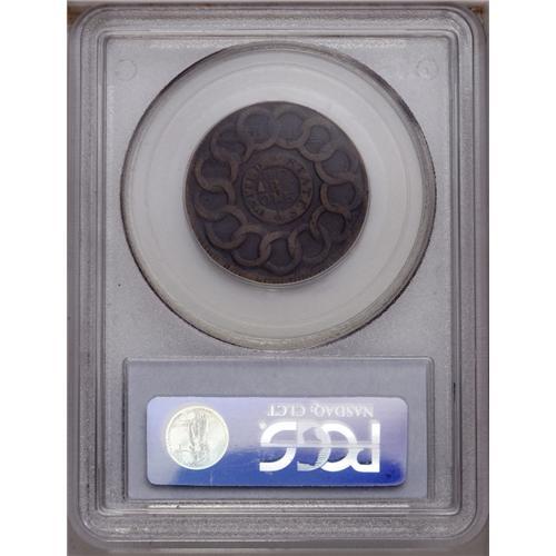 <B>1787<1C> Fugio Cent, UNITED STATES, No Cinquefoils AU55 PCGS.</B></I> Newman 1-B. This is a scarcer variety without cinquefoils on the obverse, but with a cross after the date. Heavy clash marks are visible in the fields on both sides. Attractive two-tone surfaces with dark brown fields and lighter tan devices. The obverse has a rim bruise over the I of FUGIO. Listed on page 83 of the 2006 <I>Guide Book.</B></I>