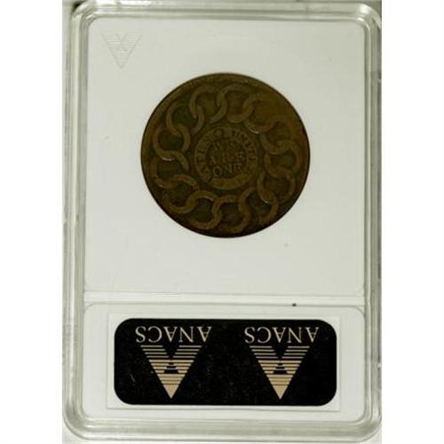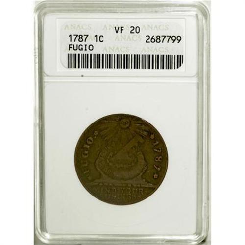 <B>1787 1C Fugio Cent, STATES UNITED, Eight-Pointed Stars VF20 ANACS.</B></I> Newman 15-Y, R.3. The only variety with two eight-pointed stars within the reverse label, which normally exhibits five-pointed stars. A granular golden-brown piece that has distributed minor marks on both sides. Listed on page 70 of the 2005 <I>Guide Book.</B></I><BR><BR><b>Shipping:</b> Coins & Currency (<a target="_blank" href="http://www.heritageauctions.com/common/shipping.php">view shipping information</a>)
