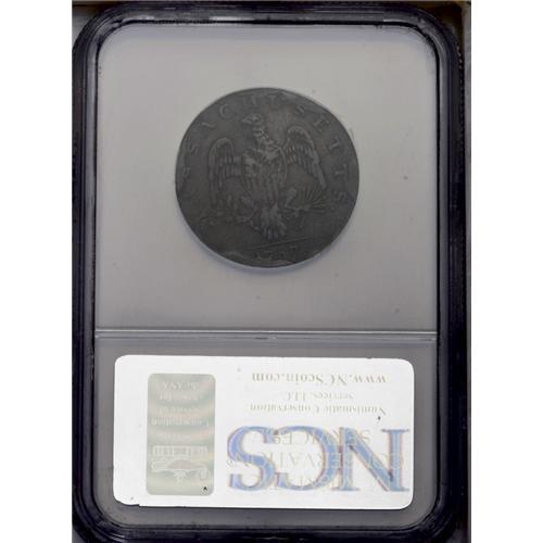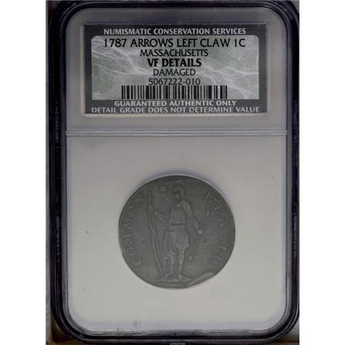 <B>1787<1C> Massachusetts Cent, Arrows in Left Talon--Damaged--NCS. VF Details.</B></I> Ryder 4-D, High R.3. A moderately circulated steel-gray Commonwealth Copper. The eagle's neck and the upper left shield exhibit a pair of ragged contact marks, and several rim bruises are readily apparent, moreso on the reverse. Listed on page 57 of the 2006 <I>Guide Book.</B></I> <BR><BR><B>Important notice:</B> Heritage usually auctions material at the rate of 200-250 lots per hour. On some occasions eBay Live bid software or the Internet may not be able to keep up with the pace of the auction. We recommend placing a realistic absentee bid now as insurance to avoid disappointment. Occasionally the auctioneer may eliminate or reject an eBay Live bid, and the auctioneer may also reopen a lot after the close of the eBay live bidding (usually because we missed an audience bid), and may reject your bid even if it shows you as the winning bidder. By bidding via eBay Live, you agree that Heritage may award the lot to another bidder at its sole discretion under the circumstances described above or any other reasonable circumstances. Since eBay bids are not shown to us until we open the lot on the floor, we treat those bids just like floor bids. In most cases the floor responds before the eBay bid is presented to us, due to Internet lag time, so for consistency we have made it a policy that floor bids are always considered first over tie eBay live bids. Also please note that all Heritage lots purchased through eBay Live carry a 20% Buyer's Premium. Please make sure you read the Terms and Conditions before you bid. This lot is being auctioned in conjunction with a live floor auction by Heritage Galleries & Auctioneers. All final auction and invoice information will be supplied by Heritage Galleries & Auctioneers, and all other information should be considered preliminary. Lot:60 <BR><BR><B>Winning Notification and Billing:</B> After the FINAL session in this auction is complete, Heritage will send e-mail and snail mail invoices. This process normally takes several days. All final auction and invoice information will be supplied by Heritage Galleries & Auctioneers, and all other information should be considered preliminary. <BR><BR>This auction will be conducted on a live auction floor and over the Internet through eBay Live. If you choose to place an absentee bid, please take a moment to <font color='#0000ff'><u><a href='http://pages.ebay.com/liveauctions/help/before/laabsentee.html'>learn how eBay Live absentee bidding works</a></u></font><font color='#000000'>
