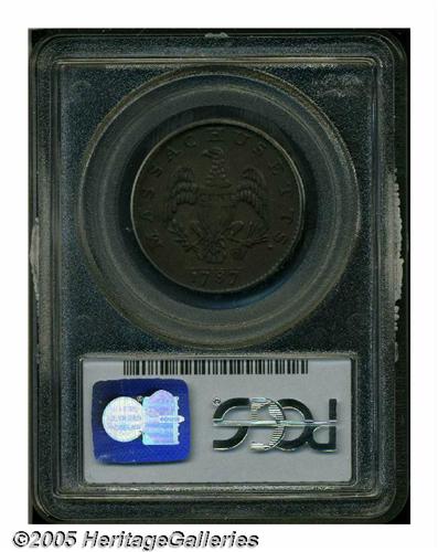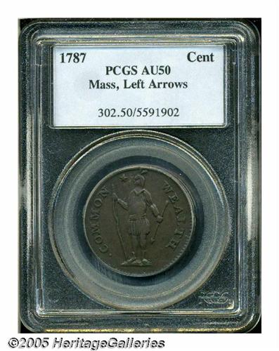 <B>1787<1C> Massachusetts Cent, Arrows in Left Talon AU50 PCGS.</B></I> Ryder 3-G, R.3. A medium-brown Commonwealth Copper, the eagle's shield and the Indian's attire show moderate highpoint rub. A couple of pinscratches are noted near the eagle's right (facing) wing. Listed on page 45 of the 2005 <I>Guide Book.</B></I>