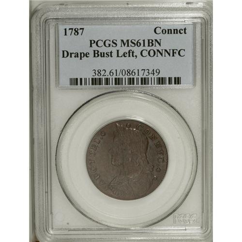 <B>1787<COPPER> Connecticut Copper, CONNFC MS61 Brown PCGS.</B></I> M. 43.1-Y, R.2. A well struck golden-brown state copper. The seated effigy displays a couple of vertical planchet flaws, and a reverse spot is noted at 1 o'clock. Among the proliferation of Draped Bust Left varieties, only Miller 43.1 has an inadvertent F instead of an E within the CONNEC legend. PCGS has certified only one other CONNFC example as Mint State. Listed on page 60 of the 2007 <I>Guide Book.</B></I>