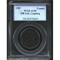 1787 COPPER Connecticut Copper, Laughing Head AU55 PCGS. M. 6.2-M, R.4. There are two Laughing Head.