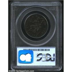1787 COPPER Connecticut Copper, Laughing Head AU55 PCGS. M. 6.2-M, R.4. There are two Laughing Head varieties of Connecticut Coppers, both of which share a common reverse that has six-pointed stars which closely resemble asterisks. While the Miller 6.1 obverse is common enough to make frequent visits to auction catalogs, the same cannot be said for the elusive M. 6.2, which has the I in AUCTORI distant from the laurel wreath. A dark brown example that is well centered, well struck, and without relevant abrasion. Minor planchet flaws throughout are completely as struck. A splendid high grade and better die variety of this popular Guide Book state copper. Population: 2 in 55 for both varieties, 2 finer (10/02). Important notice: We expect to be auctioning lots at the rate of 200-250 per hour. Sometimes eBay Premier live bid software cannot keep up with that pace, so we strongly recommend that you place a realistic proxy bid now as insurance to avoid disappointment. Also please note that all Heritage/CAA lots purchased through eBay Premier carry a 20% Buyer's Premium. Please make sure you read the Terms and Conditions.