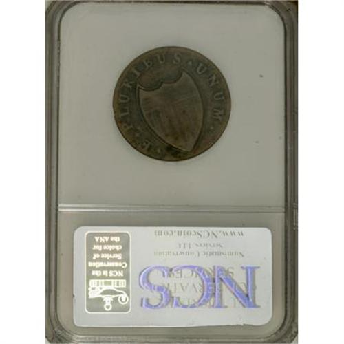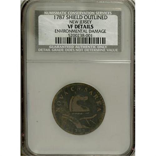 <B>1787 COPPER New Jersey Copper, Outlined Shield--Environmental Damage--NCS. VF Details.</B></I> NGC Census: (0/0). PCGS Population (21/156). (#503)<BR><BR><b>Shipping:</b> Coins & Currency (<a target="_blank" href="http://www.heritageauctions.com/common/shipping.php">view shipping information</a>)
