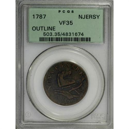 <B>1787 COPPER New Jersey Copper, Outlined Shield VF35 PCGS.</B></I> Maris 48-g, R.1. The bold diagonal die crack across the shield aids attribution. This example has bold types, and the legends are sharp aside from a couple of letters near 9 o'clock. Listed on page 66 of the 2008 <I>Guide Book</B></I>.<BR><BR><b>Shipping:</b> Coins & Currency (<a target="_blank" href="http://www.heritageauctions.com/common/shipping.php">view shipping information</a>)