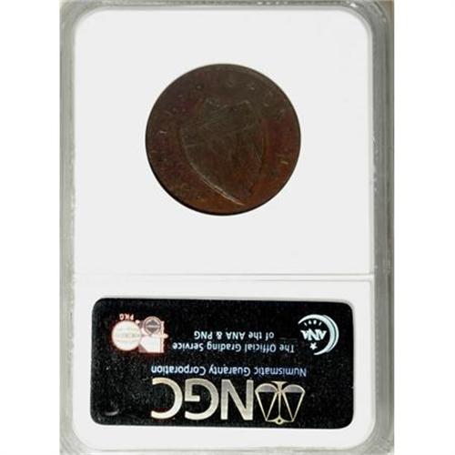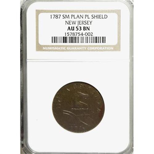 <B>1787 COPPER New Jersey Copper, Small Planchet, Plain Shield AU53 NGC.</B></I> Maris 39-a, R.2. Luster shimmers from portions of this chocolate-brown copper. Minor planchet flaws (as made) have little affect on the eye appeal. A small clip at 2 o'clock is also of mint origin. The lower reverse has faint rose-red verdigris. Listed on page 66 of the 2008 <I>Guide Book</B></I>. Census: 2 in 53, 20 finer (12/07).<BR><I>From The Liberty Collection of United States Colonial Coinage.</B></I><BR><BR><b>Shipping:</b> Coins & Currency (<a target="_blank" href="http://www.heritageauctions.com/common/shipping.php">view shipping information</a>)