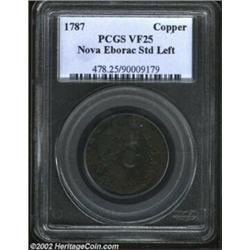 1787 COPPER Nova Eborac Copper, Seated Left VF25 PCGS. Breen-986. The dies are misaligned by approximately 10%, at 9 o'clock on the obverse and 11 o'clock on the reverse. Darker brown color, with distributed minor planchet flaws as made. The borders have a couple faint pinscratches. Listed on page 48 of the 2003 Guide Book. Important notice: We expect to be auctioning lots at the rate of 200-250 per hour. Sometimes eBay Premier live bid software cannot keep up with that pace, so we strongly recommend that you place a realistic proxy bid now as insurance to avoid disappointment. Also please note that all Heritage/CAA lots purchased through eBay Premier carry a 20% Buyer's Premium. Please make sure you read the Terms and Conditions.