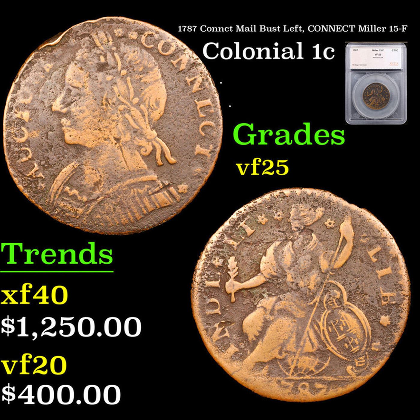 1787 Connct Mail Bust Left, CONNECT Colonial Cent Miller 15-F 1c Graded vf25 By SEGS