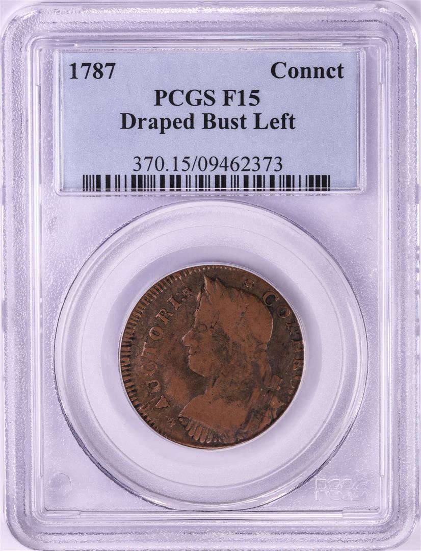 One 1787 Connecticut Draped Bust Left Colonial Copper Coin PCGS F15. PCGS Graded.