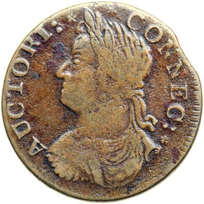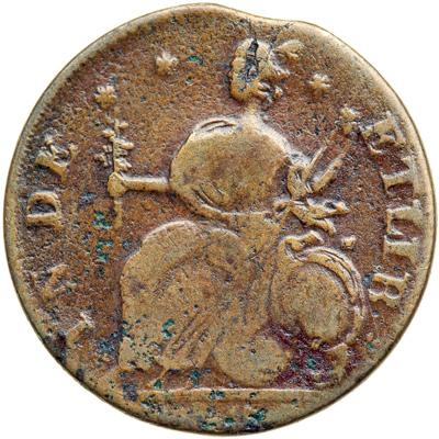 1787 Connecticut Miller 29.1-p R6. Fine-12. Attractive glossy medium brown with reddish chocolate toning in protected areas. The surfaces are mostly smooth but there are some very tiny pitmarks on the lower half of the reverse, and these pits are filled with greenish verdigris. The bottom of the date is off the planchet and the portion that remains is weak, but the legends and devices are clear. A curved planchet clip affects the dentils over NN in CONNEC, and the reverse is rotated 100 degrees CW. Weight 141.6 grains.