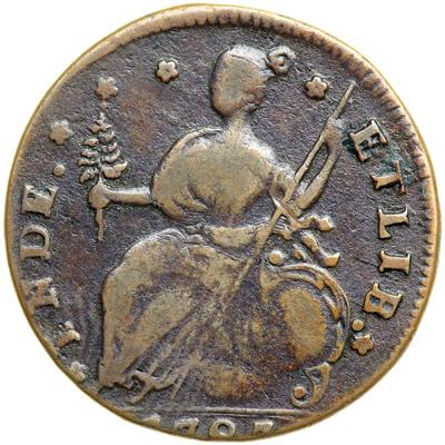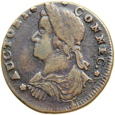 1787 Connecticut Miller 32.7-X.1 R6. VF-20. Very attractive glossy olive brown with lighter steel brown toning covering the devices. There is a bit of minor verdigris or crud dusted into the protected areas, but overall the surfaces and eye appeal of this piece are very nice for the grade. No planchet defects or contact marks. Struck slightly off center to K-2 leaving the lower half of the date off the planchet. This piece is slightly better than the Perkins and Taylor examples. Possibly CC#2 of this rare variety. Weight 138.2 grains.