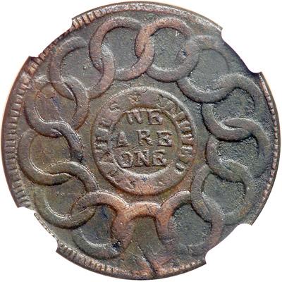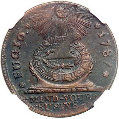 1787 Fugio Cent. Pointed rays, cinquefoils, "STATES UNITED". NGC graded AU Details, corrosion. A uniform dark-reddish brown and overall, quite pleasing.