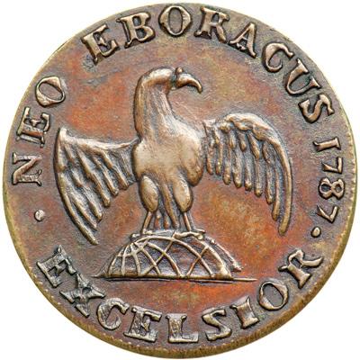 (1787) John Bolen copy of the LIBERNATUS Pattern for Thomas Machin in copper Kenney-7. EF-45. Virtually identical to the preceding lot, just a bit more friction on the highpoints. Attractive glossy brown and chocolate with olive brown in protected areas. Flawless. Weight 158.3 grains.
