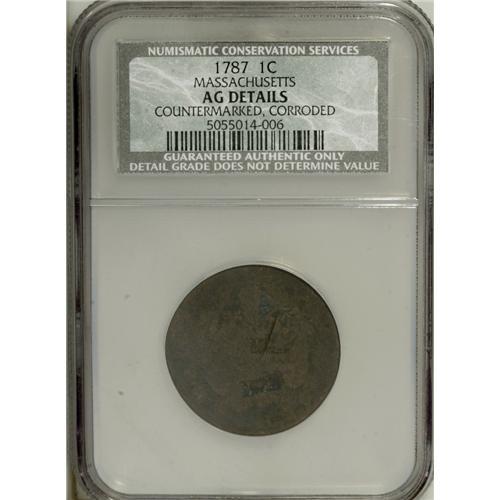 <B>1787 Massachusetts Cent--Countermarked, Corroded--NCS. AG Details.</B></I> A rectangular counterstamp with the initials JE is entered twice. One of the impressions has a weak right side, the other impression is bold. The host coin is heavily worn, but the counterstamps grade Fine.<BR><BR><b>Shipping:</b> Coin/Currency (<a target="_blank" href="http://www.heritageauctions.com/common/shipping.php">view shipping information</a>)
