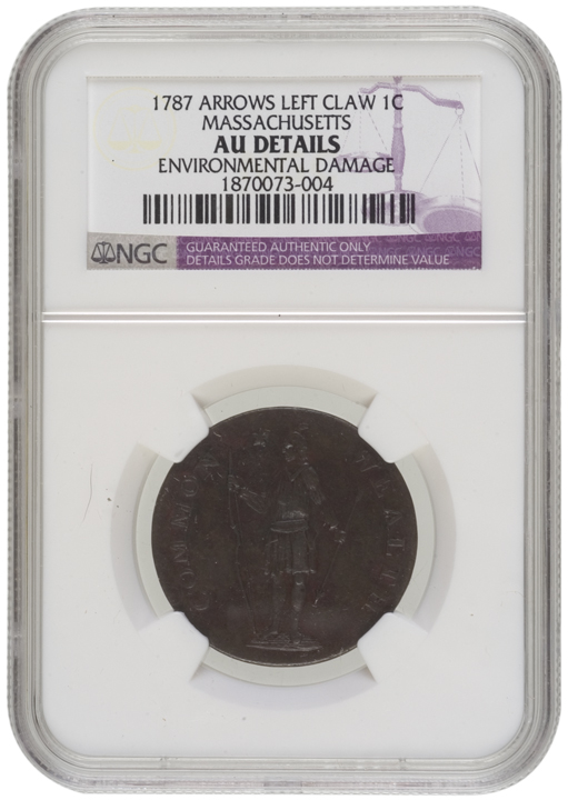 1787 Massachusetts Cent. Ryder 2-A. Environmental damage. NGC graded About Uncirculated Details.