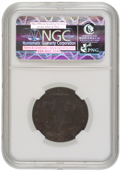151.3 grns. This impressive 1787 Cent has excellent centering, glossy natural deep chestnut surfaces and plenty of rich eye appeal. Other than a small surface irregularity in the upper left field above the Indian’s left arm and a fine shallow sratch near his right hand, it looks very nice. This coin is very close to full Mint State with just a hint of cabinet friction to the highest points. The eagle’s breast feathers, head, date and all details are all very distinct.