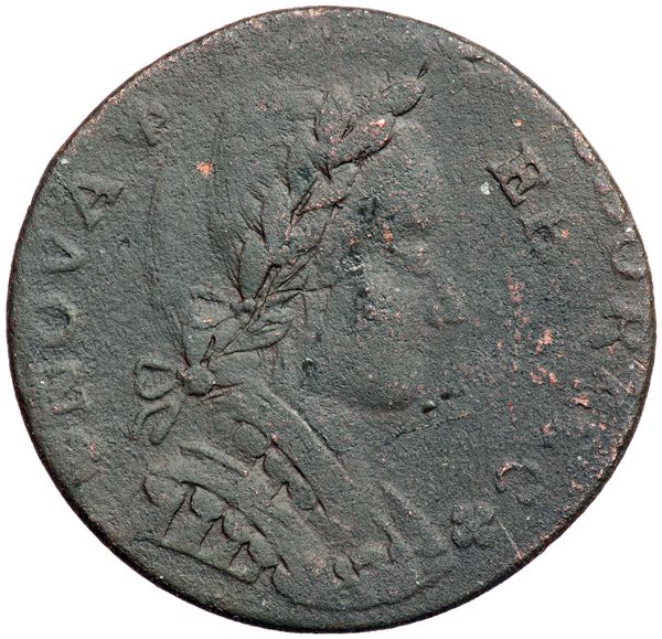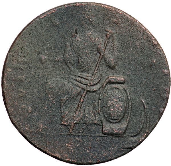 1787 Nova Eborac Breen-986 Figure Seated Left VG10. Double Struck. Sharpness EF45 or better but dull and covered with uniform fine to moderate granularity. Most likely lost in soil after little if any circulation. No marks or verdigris. Dark steel and olive. Boldly double struck. The first strike was about 4 millimeters off center to K-1 and the second was fairly well centered on the planchet. Clear evidence of the first strike shows on both sides with the lower part of EBORA above the centered EBOR and strong remnants of the shield visible to the right and slightly below the second shield. Too bad about the surfaces because this would have been a great error strike. Weight 108.9 grains.