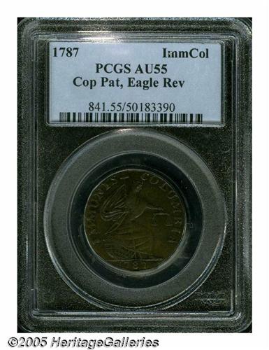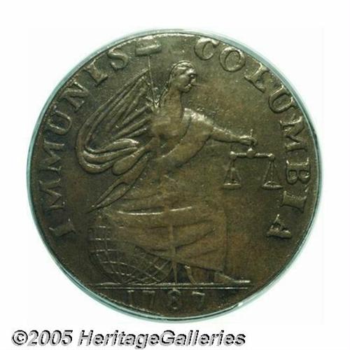 <B>1787<PIECE> Immune Columbia Piece, Eagle Reverse AU55 PCGS.</B></I> Breen-1137. Thin Planchet. Although initially proposed as a pattern, survivors of this issue are numerous enough for Breen to suggest that a certain number were coined for circulation. Complete date and all the legends legible, although the tops of the letters are cut off on the reverse. Listed on page 42 of the 2005 <I>Guide Book.</B></I>