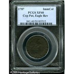 <B>1787 PIECE Immune Columbia Piece, Eagle Reverse XF40 PCGS.</B></I> Breen-1137. Breen attributes James F. Atlee as the engraver of this scarce Early American piece, privately struck as a proposal for a Federal coinage contract. A mahogany-brown piece with an unmarked reverse and a few minor blemishes on the obverse. Listed on page 42 of the 2005 <I>Guide Book.</B></I> Lot:5060