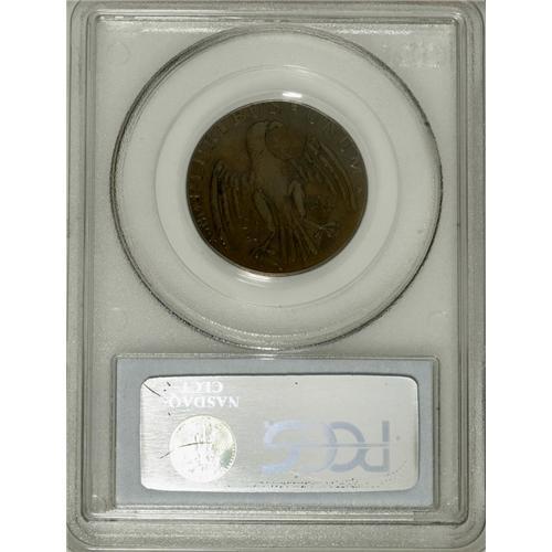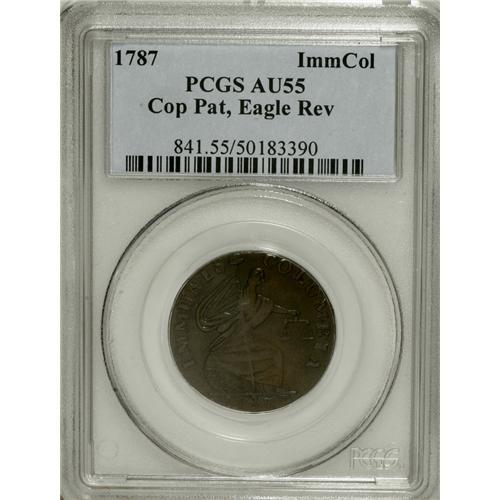 <B>1787 PIECE Immunis Columbia Piece, Eagle Reverse AU55 PCGS.</B></I> Crosby Pl. VIII, 8. Breen-1137. A beautiful medium brown piece that has a glossy and unabraded appearance. Wear is generally limited to the eagle's breast. Unlike most examples of Breen-1137, the present piece has a full date. The peripheral legends are essentially intact as well, although a few letters are tight against the rim. Listed on page 53 of the 2007 <I>Guide Book.</B></I><BR><BR><b>Shipping:</b> Coins & Currency (<a target="_blank" href="http://www.heritageauctions.com/common/shipping.php">view shipping information</a>)