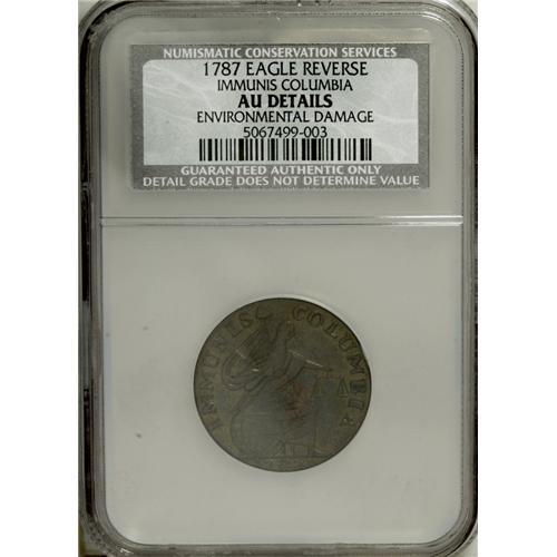 <B>1787 PIECE Immunis Columbia Piece, Eagle Reverse--Environmental Damage--NCS. AU Details.</B></I> Crosby Pl. VIII, 8. Breen-1137. A scarce variety, perhaps struck at the private Rahway Mint. Repaired on Liberty's thigh, and opposite on the juncture of the right (facing) wing with the chest. The eagle's chest shows wispy vertical marks that suggest plumage. A small mint-made clip is seen at 2:30. Listed on page 53 of the 2007 <I>Guide Book.</B></I><BR><BR><b>Shipping:</b> Coin/Currency (<a target="_blank" href="http://www.heritageauctions.com/common/shipping.php">view shipping information</a>)
