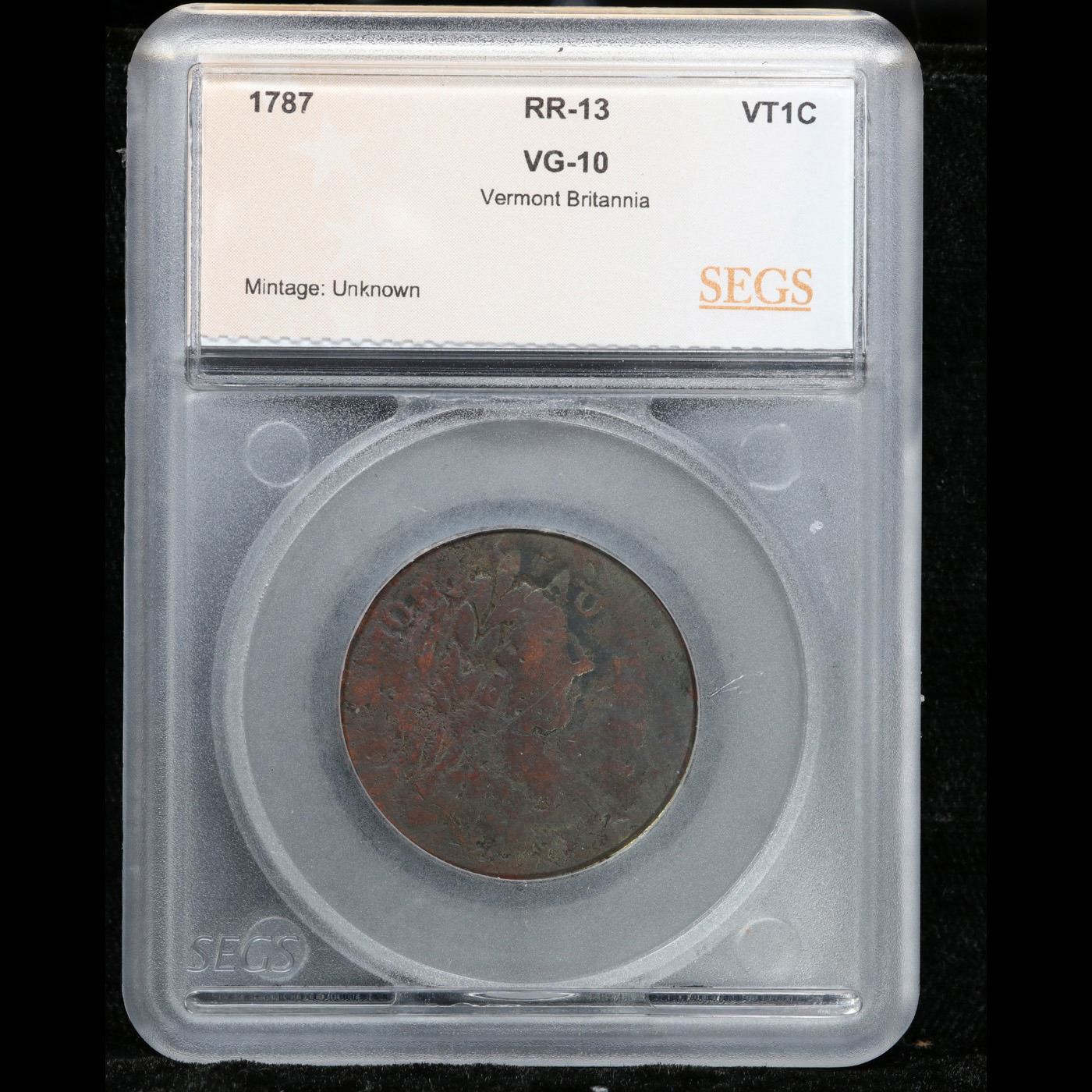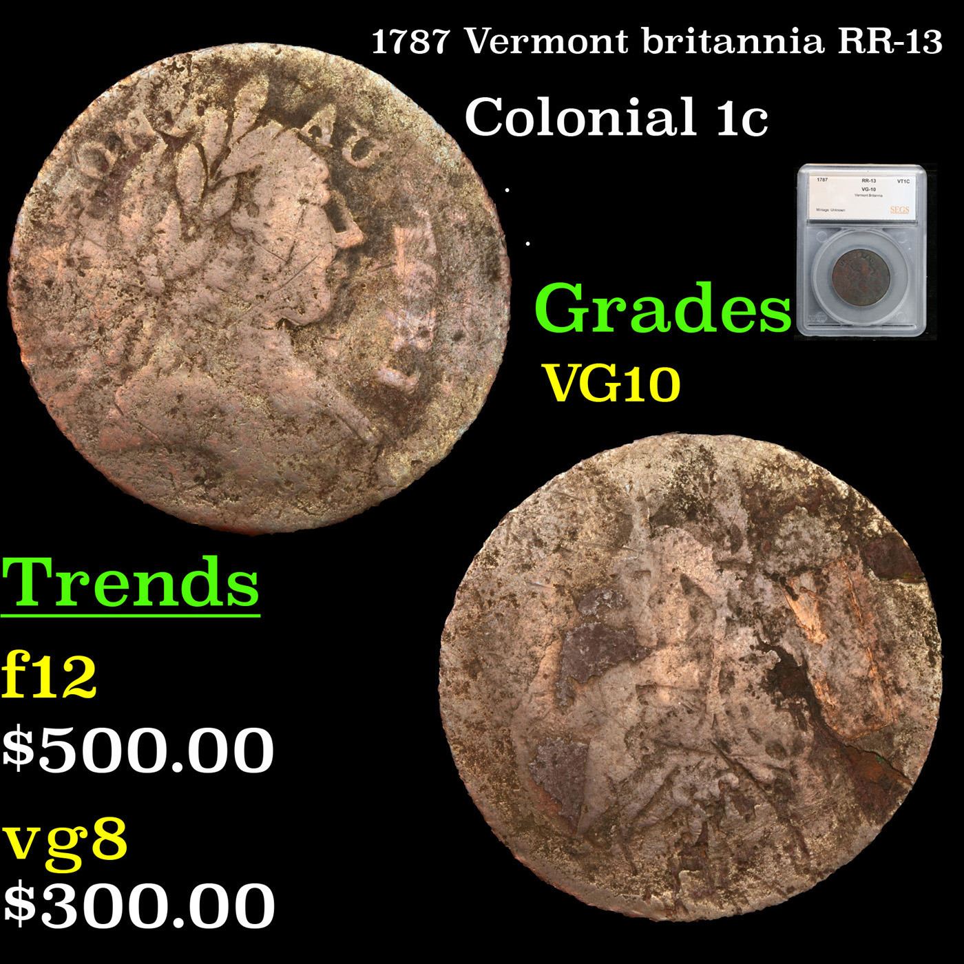 1787 Vermont britannia RR-13 Colonial Cent 1c Graded VG10 by SEGS.