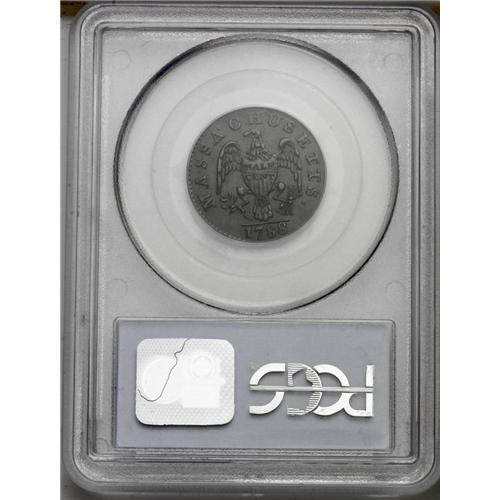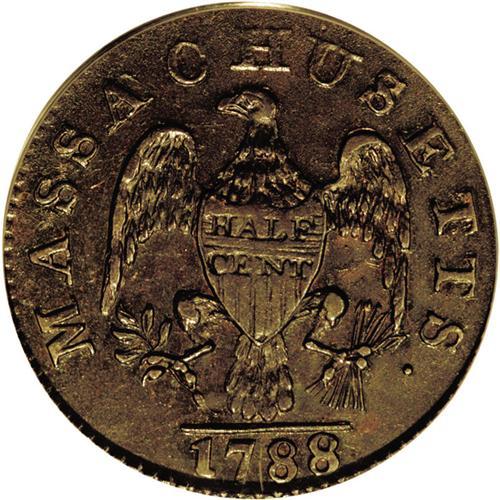 <B>1788<1/2 C> Massachusetts Half Cent AU55 PCGS.</B></I> Ryder 1-B, R.2. This well struck ebony-brown piece was made from a problem-free planchet. A couple of minor handling marks are seen, with those near the bow barely worthy of singular mention. Listed on page 57 of the 2007 <I>Guide Book.</B></I><BR><I>From The Long Beach Family Collection.</B></I>