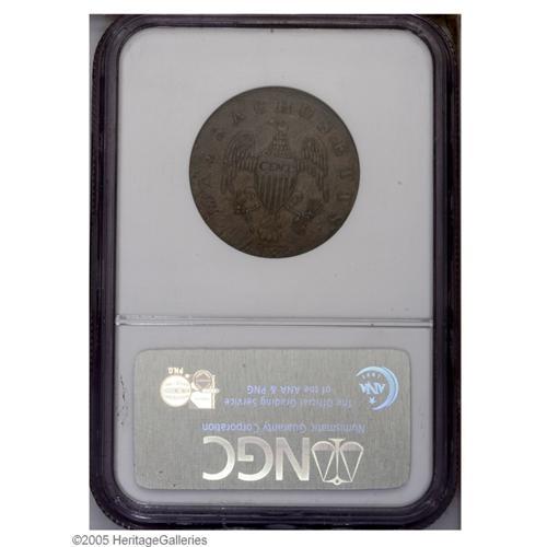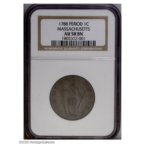 <B>1788<1C> Massachusetts Cent AU58 NGC.</B></I> Period after MASSACHUSETTS. Ryder 3-A, Low R.4. A splendidly detailed golden-brown representative. The borders show traces of a few faint mint-made planchet striations, and a small rim bruise is noted at 4:30, but an impressive piece overall, without spotting or significant flaws. Listed on page 57 of the 2006 <I>Guide Book.</B></I>