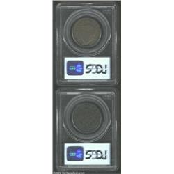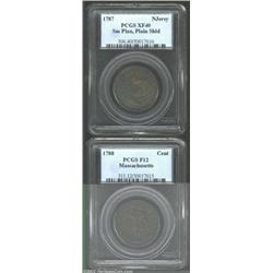 1788 1C Massachusetts Cent Fine 12 PCGS, Ryder 12-I, the wear is even, although the obverse periphery is a little softly defined, and the richly toned, steel-brown surfaces reveal a few minor planchet flaws (as struck) over the lower right obverse; and a 1787 New Jersey Copper, Small Planchet, Plain Shield XF40 PCGS, M. 53-j, R.3, some steel-olive patina has gathered on the obverse of this otherwise orange-brown survivor, well detailed for the type as well as the grade. 2 coins Important notice: We expect to be auctioning lots at the rate of 200-250 per hour. Sometimes eBay Premier live bid software cannot keep up with that pace, so we strongly recommend that you place a realistic proxy bid now as insurance to avoid disappointment. Also please note that all Heritage/CAA lots purchased through eBay Premier carry a 20% Buyer's Premium. Please make sure you read the Terms and Conditions.