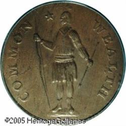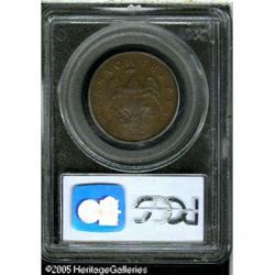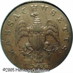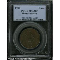 <B>1788 1C Massachusetts Cent MS62 Brown PCGS.</B></I> Ryder 10-L, R.1. Period After Massachusetts. This richly detailed Commonwealth copper has golden-brown and lavender patina. A few minor retained laminations affect the left borders of each side, and close inspection reveals a couple of wispy pinscratches below the right (facing) wing. Scarce in Mint State. Listed on page 46 of the 2005 <I>Guide Book.</B></I> Population: 2 in 62, 12 finer (1/05). Lot:5018
