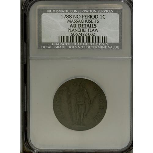 <B>1788 1C Massachusetts Cent, No Period--Planchet Flaw--NCS. AU Details.</B></I> Ryder 6-N, Low R.3. Ryder's N reverse is the only No Period reverse die, which makes the No Period variety significantly scarcer than its Period counterpart. This medium to dark brown example has moderate highpoint wear, and is smooth save for a reverse planchet flaw between 9 o'clock and 10:30. Listed on page 57 of the 2007 <I>Guide Book.</B></I><BR><I>From The Monedas Oro Collection.</B></I><BR><BR><b>Shipping:</b> Coin/Currency (<a target="_blank" href="http://www.heritageauctions.com/common/shipping.php">view shipping information</a>)