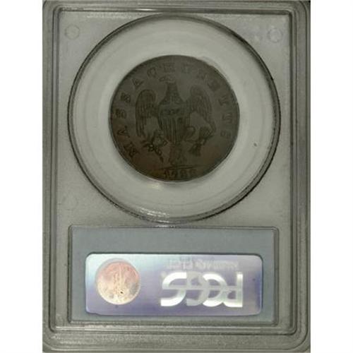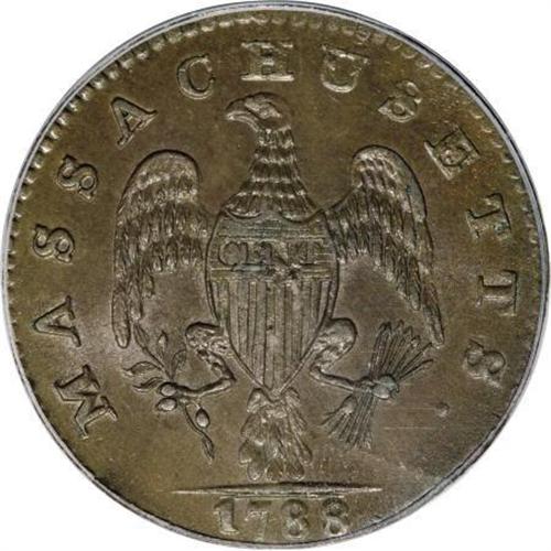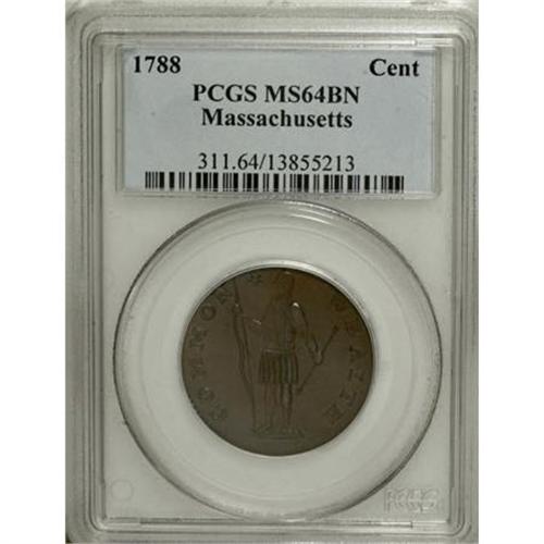 <B>1788 1C Massachusetts Cent, Period MS64 Brown PCGS. CAC.</B></I> Ryder 8-C, R.3. A glossy deep golden-brown representative that lacks the planchet deficiencies usually encountered on high grade state copper coinage. Nearly unabraded, and well struck except for slight blending on the Indian's clothing and the eagle's claws. Listed on page 57 of the 2008 <I>Guide Book. </B></I>Population: 2 in 64 Brown, 2 finer (11/07).<BR><I>From The Madison Collection.</B></I><BR><BR><b>Shipping:</b> Coins & Currency (<a target="_blank" href="http://www.heritageauctions.com/common/shipping.php">view shipping information</a>)