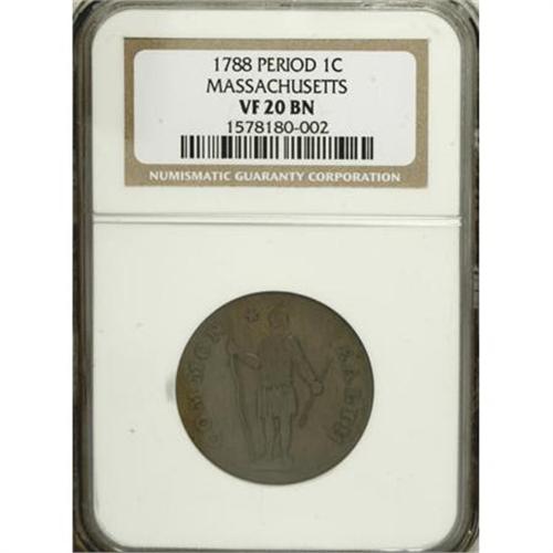 <B>1788 1C Massachusetts Cent, Period VF20 NGC.</B></I> NGC Census: (0/0). PCGS Population (0/1). (#312)<BR><BR><b>Shipping:</b> Coins & Currency (<a target="_blank" href="http://www.heritageauctions.com/common/shipping.php">view shipping information</a>)