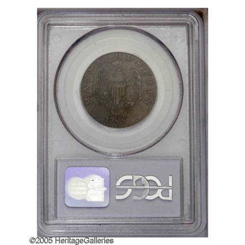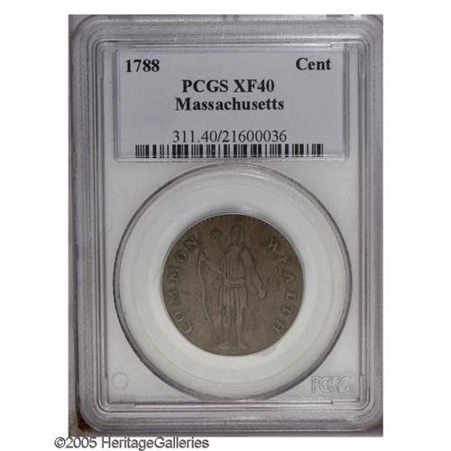 <B>1788<1C> Massachusetts Cent XF40 PCGS.</B></I> Period after MASSACHUSETTS. Ryder 4-G, R.5. A crisp example with a bold CENT and nearly unmarked surfaces. The left half of the reverse has a hint of charcoal patina, and the Indian's left (facing) knee has a mint-made planchet flaw. A rare variety, the close CO in COMMON and the distant final 8 in the date help affirm the marriage. Listed on page 57 of the 2006 <I>Guide Book.</B></I>