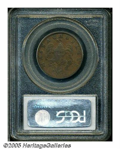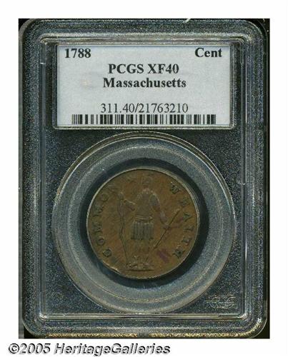<B>1788<1C> Massachusetts Cent XF40 PCGS.</B></I> Ryder 2-B, R.1. Pleasing light brown with some pinkish red patina on the obverse. A few minor rim bruises are present on both sides, but they are not distracting. Unevenly struck with weak upper obverse and lower reverse.