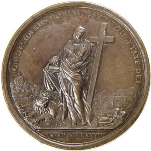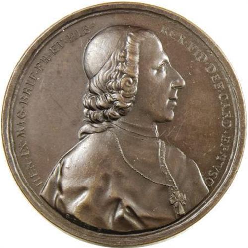 <B>1788 Bronze Medal Commemorating the Death of Prince Charles Stuart.</B></I> BHM-282, Woolf-73.1a. Bronze, 52 mm, 59.2 gm. 1788 medal by Giovanni Hamerani, bust of the Cardinal right; reverse Piety stands by lion holding cross, St. Peter's in the distance. <BR> <BR><BR><b>Shipping:</b> Coins & Currency (<a target="_blank" href="http://www.heritageauctions.com/common/shipping.php">view shipping information</a>)