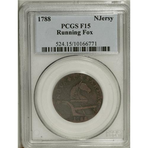 <B>1788<COPPER> New Jersey Copper, Running Fox Fine 15 PCGS.</B></I> M. 77-dd, R.4. The scarce Running Fox variety is represented by only two reverse dies, bb and dd. This glossy piece has dark brown fields and lighter tan-gray devices. An interesting planchet flaw is noted on the obverse border near 4 o'clock. Listed on page 67 of the 2006 <I>Guide Book.</B></I>